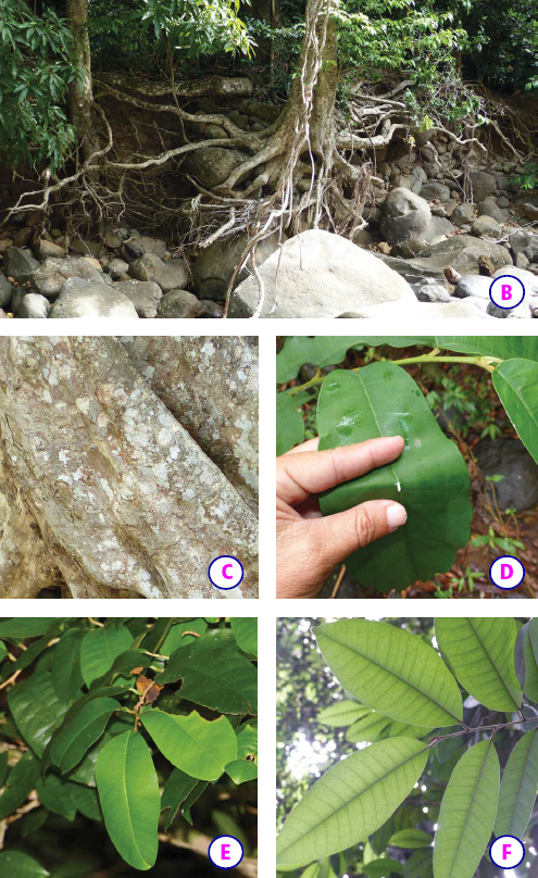 Arbre (A) de 5 à 20 m de haut dépassant 50 cm de diamètre. Tronc sans patte ou avec pattes aliformes pouvant atteindre jusqu’à 0,5 m de haut. En situation de pente, l’espèce fait des racines (B) qui serpentent à la surface du sol. Ecorce (C) d’aspect externe gris cendré, marron ou noirâtre, fragile, qui tombe en poussière lorsque gratté, plus ou moins feuilletée écailleuse, caduc en petites écailles étroites. Présence de latex très collant et crémeux qui s’écoule du tronc, des rameaux et des feuilles quand on les brise (D). Feuilles (D, E, F) alternes, 6-18 x 3-6 cm; limbe oblancéolé, à court acumen obtus, en coin à la base; face supérieure vert à vert sombre, face inférieure vert-grisâtre ou argentée, glabre ou à duvet soyeux ; 11-12 paires de nervures parallèles. Fleurs odorantes, pédonculées, petites (7 mm) blanches à jaune-verdâtre, disposées à l’axe des feuilles. Fruit : baie de 8-18 mm de long et de couleur bleu sombre à maturité. Graine unique, brune et brillante.