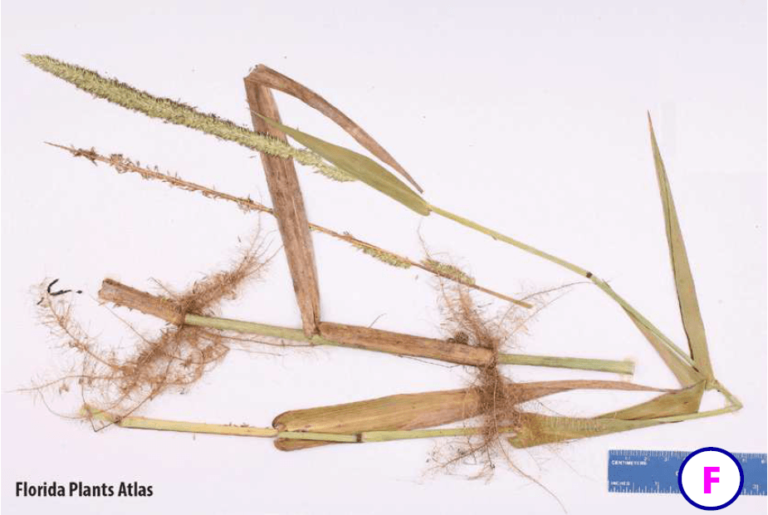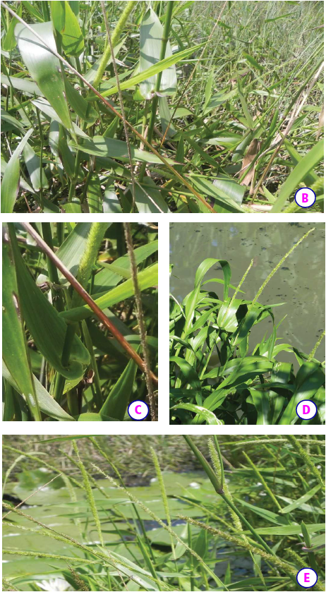 Grande graminée (A) vivace de tiges érigées ou semi-dressées (ascendantes) et de base rampante (prostrée) ou flottante sur des eaux peu profondes. Tiges glabres et plus ou moins comprimées. Espèce allant de 50c m à 2,5 m de haut, mais pouvant parfois atteindre jusqu’à 3,5 m. Nœuds contractés, noirs. Feuilles (B) avec limbe relativement large par rapport à l’autre espèce de graminées (10-45 cm de long et 2-6 cm de large). Base du limbe cordée-amplexicaule (C) à la base ciliée par quelques poils grossiers. Inflorescence (D, E) en panicule de 15-30 (50) cm x 7-10 cm de longeur. Epillet (mini-inflorescence) lanceolé, spiciforme (4-5 mm) et acuminé.