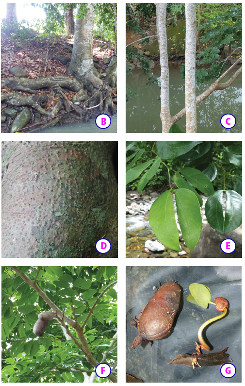 Phénologie : la floraison s’étend de juin à juillet avec l’apparition des jeunes feuilles. Fruits, germination et plantules observés en mai en Guadeloupe sur la côte au vent.