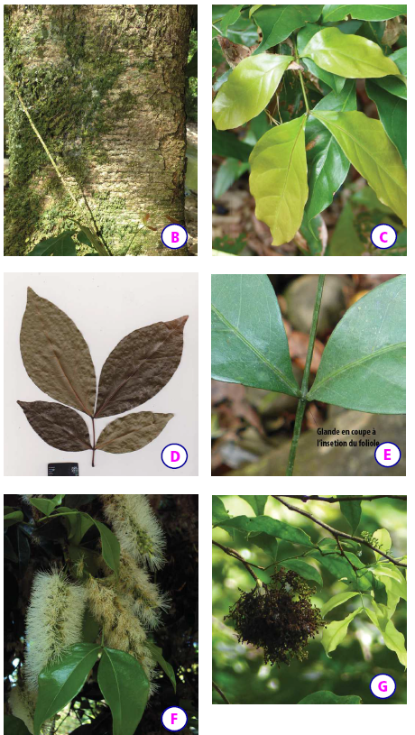Arbre (A) moyen à grand, pouvant atteindre 15m de hauteur. Tronc (B) sans patte. Ecorce (B) avec lenticelles denses disposées en lignes horizontales plus ou moins interrompues et très serrées. Feuilles (C,D) alternes, composées de 2-4 paires de folioles glabres. Pétiole et rachis (E) non ailé (à peine émarginé), canaliculés avec une petite glande à l’insertion de chaque paire de folioles. Folioles (D) glabres (4-15 × 3-8 cm), oblancéolées, apex à court acumen et base cunéiforme. Inflorescences (F) en épis de 10-15 cm de long. Fleurs blanches et sessiles; corolle tubulaire blanche (6mm). Etamines blanches d’environ 1,7 cm de long. Fruit : gousse oblongue (5-15 × 2-3,5 cm de long), aplatie, glabre à marge épaisse avec 5-7 graines. Graines entourées par une pulpe blanche. L’inflorescence peut être infectée par des champignon qui provoque des «balais de sorcière» (G).