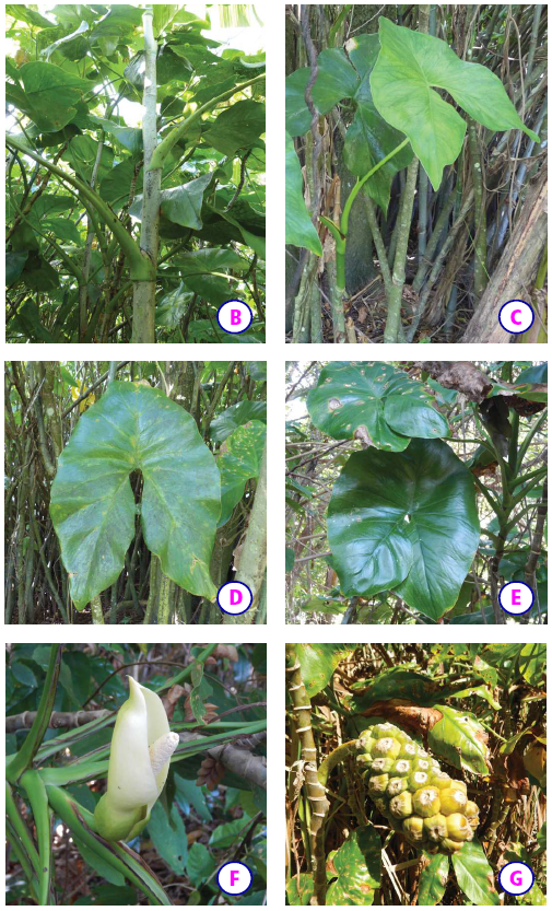 Arbuste (A) aquatique dressé (1,5-3,5 m), enraciné, porté par une longue tige cylindrique (3-6 cm de diamètre) (B), souvent renflée à la base, creuse, avec (ou sans) épines courtes et aplaties. Pétiole (C) de 18- 30 cm de longueur. Grandes feuilles (D, E) simples, alternes, entières. Limbe sagitté (20-35 cm), épais et cireux, à marge ondulée, entière; lobes basilaires plus grands que le lobe terminal. Nervures latérales saillantes en dessous. Inflorescences (F) portées par un pédoncule érigé (15 cm longeur), avec une spathe ouverte et un spadice libre, cylindrique, vert à l’extérieur et blanc ou pourpre à la base à l’intérieur. Infrutescence jusqu’à 15 cm de longueur x 10 cm de diamètre. Fruits (G) : baies, spongieuses à la base, ligneuses à l’apex. Chaque fruit contient une graine ovoïde, lisse.