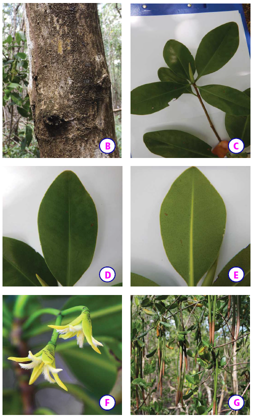 Arbuste ou petit arbre (A) de 2 à 8 m de hauteur et pouvant atteindre jusqu’à 40 cm de diamètre. Imposantes racines aériennes (racines- échasses) (A) disposées en arceaux jusqu’à 2,5m de haut. Ecorce (B) grise-noirâtre. Rameaux verticillés. Branches couvertes de cicatrices foliaires et stipulaires, stipules étroites et lanceolées. Feuilles (C) opposées, épaisses, elliptiques (5-15 cm de longueur), face supérieure de couleur vert foncé et lustrée (D), face inférieure ponctuée de noir (E). Fleurs (F) groupées par paires, sépales jaune épais et coriaces, étalés ou réfléchis, carénés à l’intérieur; pétales jaunes pâles, coriaces à marge cotonneuse. Fruits (G) coniques de 2-3 cm. Graines (G) germent directement sur l’arbre et développent une radicule d’une trentaine de cm de longueur après germination, brunâtre dans le tiers supérieur.