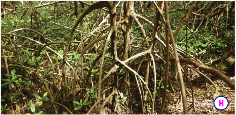 Ancrage du système racinaire : Racine pivotante et racines aériennes bien développées (H)
