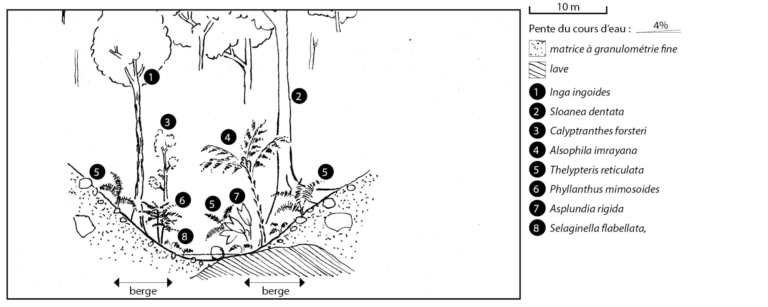 Arbolado : Inga ingoides, Calyptranthes forsteri, Tapura latifolia, Myrcia deflexa, Sloanea dentata, Prestoea montana. Arbustivo : Alsophila imrayana, Faramea occidentalis, Phyllanthus mimosoides. Herbacées : Selaginella flabellata, Thelypteris reticulata, Asplundia rigida.