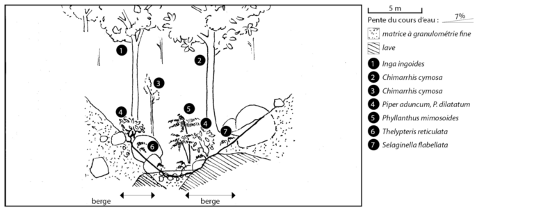 Arbolado : Inga laurina, Chimarrhis cymosa, Inga ingoides, Miconia mirabilis, Myrcia deflexa, Eugenia duchassaingiana, Sloanea dentata.