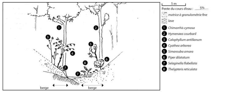 Arbolado : Calophyllum antillanum, Chimarrhis cymosa, Hymenaea courbaril, Protium attenuatum, Sterculia caribaea, Simarouba amara, Cecropia schreberiana, Syzygium jambos, Artocarpus altilis, Mangifera indica, Bambusa vulgaris Arbustivo : Herbáceo, Cyathea arborea, Psychotria mapourioides, Clidemia umbrosa, Dracaena fragrans Herbacées : Thelypteris reticulata, Selaginella flabellata, Ischnosiphon arouma, Adiantum latifolium, Dieffenbachia seguine.