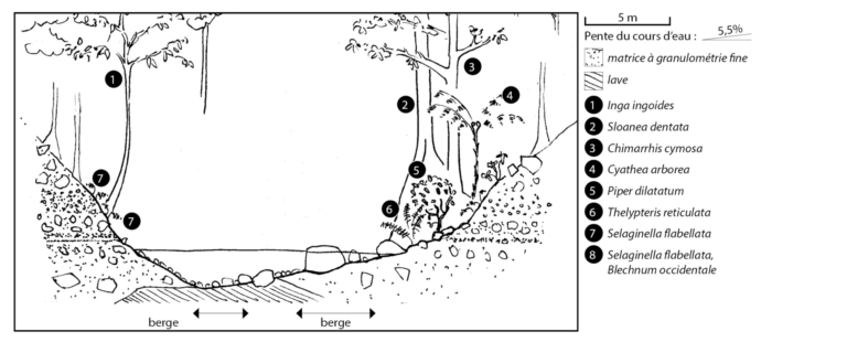 Arbolado : Chimarrhis cymosa, Sloanea dentata, Inga ingoides, Cordia sulcata, Ficus insipida, Sterculia caribaea, Cedrela odorata*, Tabebuia heterophylla*, Lonchocarpus punctatus*, Artocarpus altilis, Mangifera indica, Terminalia catappa, Theobroma cacao Arbustivo : Herbáceo, Thelypteris reticulata, Clidemia hirta, Cyathea arborea, Asplundia rigida (>200 m), Pachystachys spicata, Ricinus communis, Dracanea fragrans Herbacées : Selaginella flabellata, Blechnum occidentale, Dieffenbachia seguine, Heliconia wagneriana, Commelina diffusa, Cenchrus purpureus, Tradescantia spathacea, Ipomaea tilacea