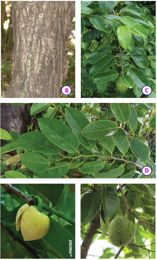 Petit arbre (A) qui peut atteindre 10 m de haut et 27 cm de diamètre, à contreforts. Ecorce (B) grise à noirâtre et très fibreuse, légèrement fissurée longitudinalement sur jeune arbre de 8 cm de diamètre ou fissurée en bandelettes étroites plus ou moins anastomosées et assez profondes. Feuilles (C, D) alternes et distiques, de 7-15 x 4-6 cm; ovales, oblongues ou elliptiques ; apex acuminé et base arrondie ; nervure médiane imprimée ; glandes translucides sur le limbe. Fleurs solitaires, subglobuleuses (10- 15mm) ; 6 pétales vert-jaunâtre, concaves, valvaires, épais et charnus. Fruits (E) jaune-orangé, cordiforme, ovoïdes à sphériques, (5-11 x 4-7 cm), pendants, lisses, faiblement auréolés, arrondis au sommet, imprimés à la base, de couleur vert clair puis jaune, tâchés de brun à maturité, pulpe orange, aromatique, insipide. Graines marron, longues d’env. 15 mm.